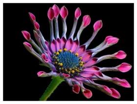 Stunning close-up shot of a vibrant pink African daisy blooming against a black background.