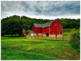 Vibrant red barn amidst lush greenery and cloudy skies in Wisconsin.