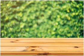 A wooden table surface with a vibrant green garden