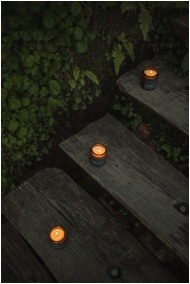 Warm lit candles arranged on wooden steps surrounded by green foliage for a cozy ambiance.