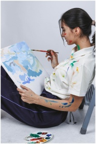 Side view of a young female artist painting abstra