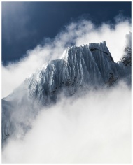 Breathtaking view of a snow-capped mountain peak rising through the misty clouds on a winter day.