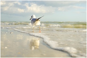 A serene image of a seagull walking along the tranquil Avon Park beach, with waves gently lapping at the shore.