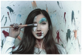 Vibrant portrait showcasing a woman with creative face paint and brush, embodying artistic expression.