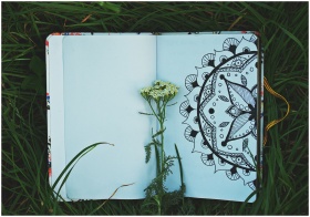 An open notebook with a mandala design lies in fresh grass, accented by a sprig of white flowers.