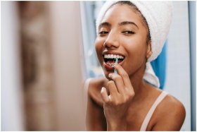 Smiling African American female with white towel on head cleaning teeth with dental flosser in bathroom