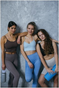 Three women in sports outfits pose against a gray wall, embodying fitness and style.