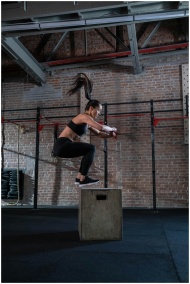 A fit woman executes a box jump in a gym setting, showcasing athleticism and fitness.