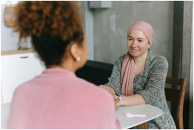 Two women sharing a supportive moment, symbolizing cancer awareness indoors.