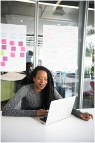 Confident woman working on laptop at modern indoor