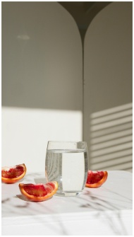 Minimalist composition of grapefruit slices with a glass of water in natural light.