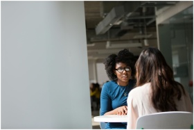 Two women engaged in a discussion in a modern offi