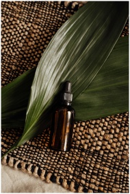 Brown glass dropper bottle on woven mat with green leaves, top view.