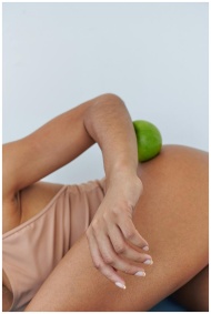 Close-up of a woman holding a green apple, symboli