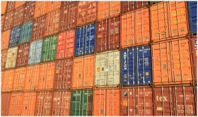 Colorful shipping containers stacked in a harbor, symbolizing global trade.