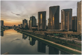 Stunning skyline of modern skyscrapers reflecting in the river at dusk, creating a peaceful cityscape.