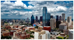 A stunning panoramic view of the Dallas skyline under dramatic clouds, capturing the city's iconic skyscrapers.