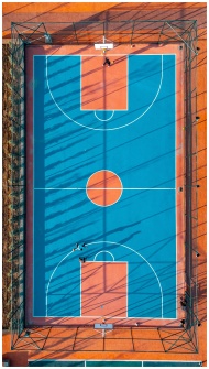 Explore an aerial view of a vibrant outdoor basketball court in Selçuklu, Konya, Türkiye.