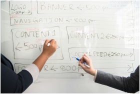 Two people collaboratively planning on a whiteboard with creative strategy.