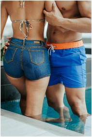 A couple enjoying a poolside moment in stylish swi