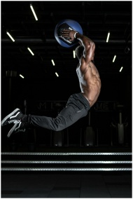 Muscular athlete performing a high jump with a medicine ball in a gym, showcasing strength and fitness.