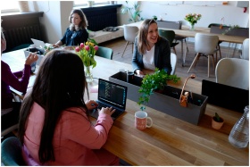 Women collaborating in a modern office environment with laptops and indoor plants, fostering teamwork.
