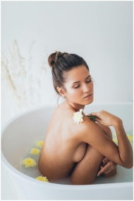 A peaceful moment of relaxation with a woman enjoying a flower bath, creating a spa-like atmosphere.