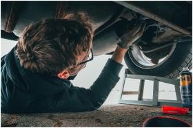 Mechanic skillfully repairing car undercarriage in outdoor setting with tools.