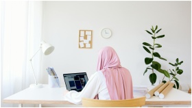 A Muslim woman in a hijab working on a laptop in a modern, minimalist office setting.