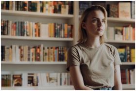 A young woman stands in a bookstore surrounded by