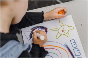 High angle of crop unrecognizable kid sitting at table and holding marker while painting colorful picture in album for drawing