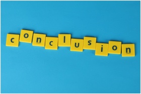 Yellow letter tiles spelling 'conclusion' on a vibrant blue background emphasizing creativity and achievement.