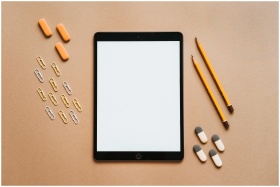 A minimalist flat lay of a tablet surrounded by sc