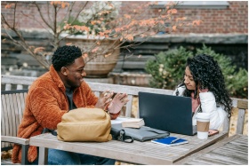 Two students study outdoors in a park, enjoying co