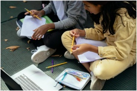 From above of crop multiethnic schoolchildren with