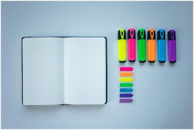 Flat lay of colorful highlighters and an open note