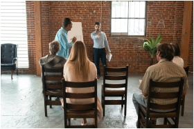 A group of adults attending an indoor workshop wit