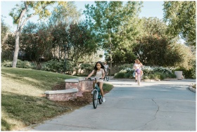 Two children ride bicycles on a path in a sunny park, surrounded by greenery.