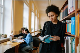 African American woman reading a book in a bright library setting, embodying knowledge and empowerment.