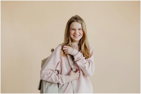 Happy teenage girl with a backpack and pink sweater smiling in a studio setting.
