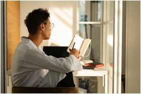 A young man sitting by a window in a sunlit home office, writing in a notebook.