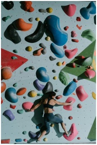 Woman navigating colorful bouldering wall in indoor climbing gym.