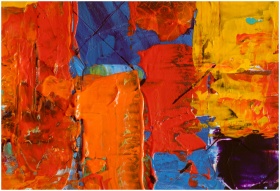 Bold and colorful abstract painting with dynamic textures and vivid colors.