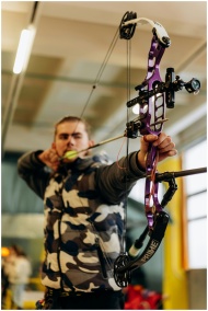 A man intensely focuses on aiming a purple compound bow at an indoor archery range.