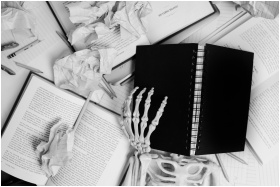 Skeleton overwhelmed by crumpled papers and open books, symbolizing study burnout.