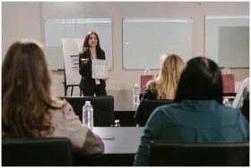 A business seminar showcasing a female presenter awarding certificates to attendees.
