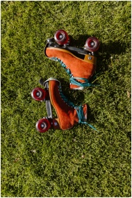 Colorful vintage roller skates placed on vibrant g
