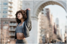 Curly haired toned ethnic female in activewear doing warming up exercise while training on city street