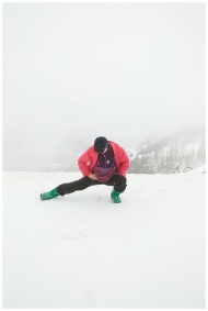 Person stretching in a snowy winter landscape, wea