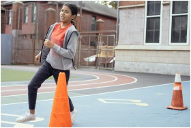 Full body of active Hispanic schoolgirl in sportswear running while having physical education class
